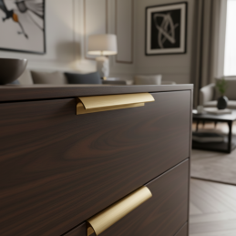 Az arany szálcsiszolt szín szépen érvényesül sötét és világos felületeken egyaránt, remekül kombinálható natúr fával, matt lakkozással és modern dekorokkal is. A fogantyú ideális konyhákba, fürdőszobákba, gardróbokba, komódokra és design bútorokra. Az ergonomikus forma kényelmes fogást és kellemes mindennapi használatot biztosít.