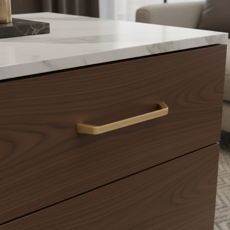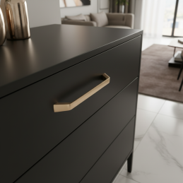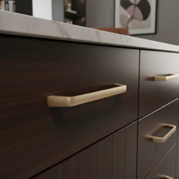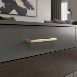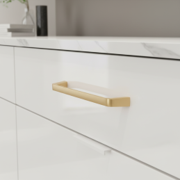 A SAMARA fogantyú arany szálcsiszolt felülettel elegáns és időtlen dizájnelem, amely luxus, mégis visszafogott megjelenést kölcsönöz a bútornak. Enyhén megtört formája finom és harmonikus hatást kelt, így könnyen kombinálható modern és klasszikusabb enteriőrökkel is. A szálcsiszolt arany kivitel meleg fémes tónust és enyhén matt hatást eredményez, amely gyönyörűen érvényesül fa, lakkozott és sötétebb felületeken is.