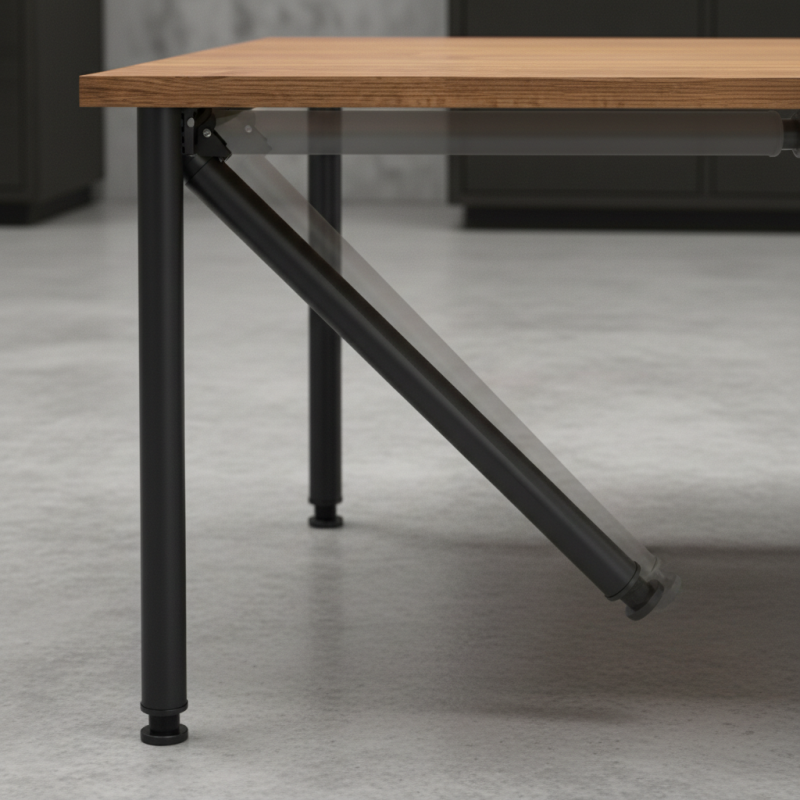 A felső részben található mechanizmus lehetővé teszi a láb egyszerű összecsukását, így a munkalapok elrejthetők a szekrényben, a polcok leengedhetők és felemelhetők, vagy az asztal kényelmesen összecsukható.