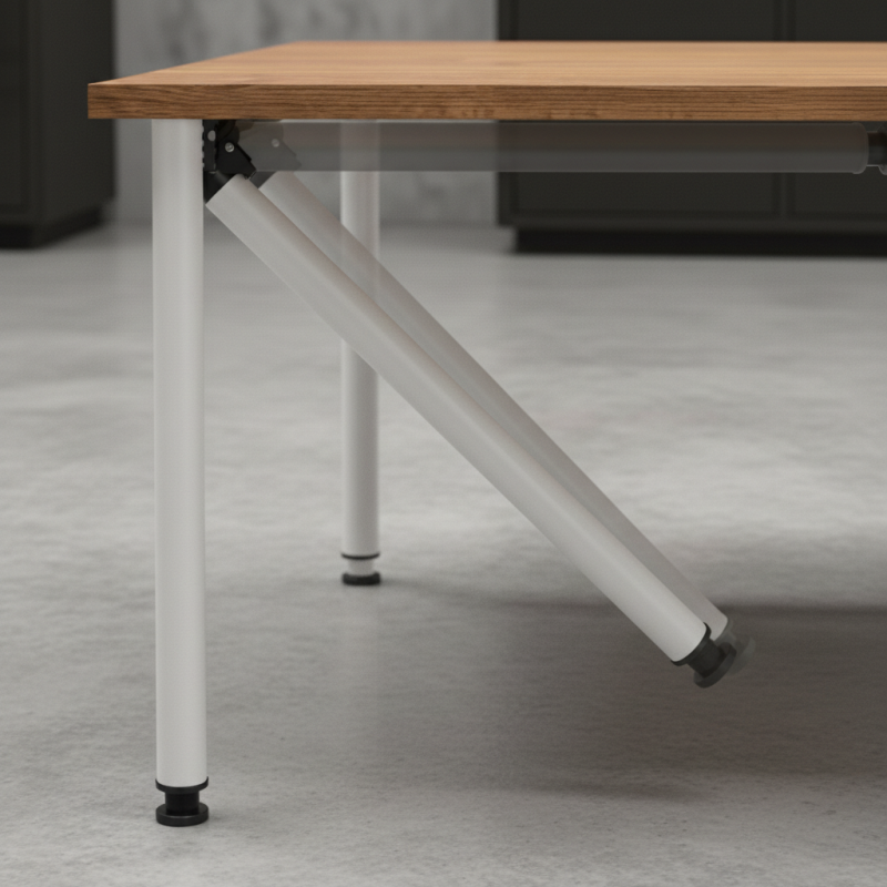 A felső részben található mechanizmus lehetővé teszi a láb egyszerű és biztonságos összecsukását, így a munkalap vagy asztal kényelmesen lehajtható és tárolható.