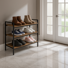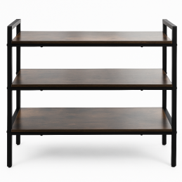 Tegyen rendet elegánsan! MAGNA cipőtartó állvány egyesíti a funkcionalitást, stílust és tartósságot egyetlen dizájnos darabban. A fekete fém váz és a meleg árnyalatú fa kombinációja modern loft megjelenést kölcsönöz, amely otthonosságot és harmóniát ad előszobájának, gardróbjának vagy irodájának.