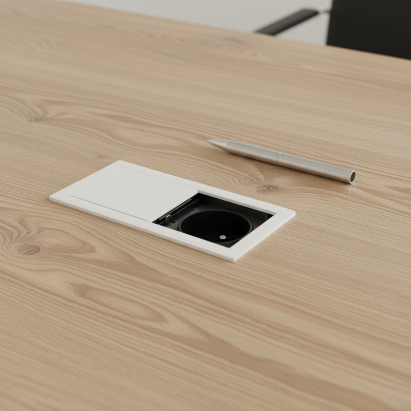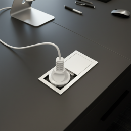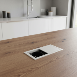 Elegáns beépített aljzat VersaHit Mono tiszta fehér kivitelben modern és praktikus megoldás konyhákhoz, munkalapokhoz, irodai terekhez és lakásbútorokhoz is. Kényelmes hozzáférést biztosít az áramhoz zavaró elemek nélkül a felületen, miközben megőrzi a belső tér minimalizmusát.