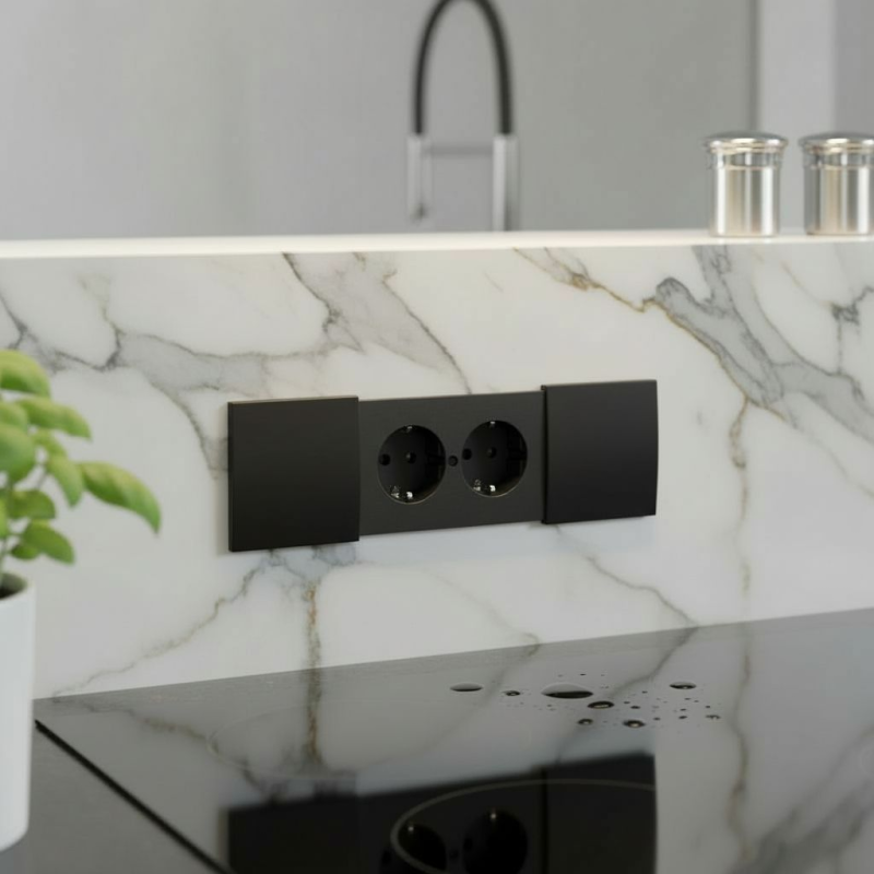 Belső aljzat BACHMANN DUE modern fekete kivitelben elegáns és praktikus megoldás konyhákhoz, munkalapokhoz vagy irodai helyiségekhez. A francia szabványú aljzatok (E típus) használatának köszönhetően teljesen kompatibilis a szlovák, cseh és lengyel elektromos rendszerrel.