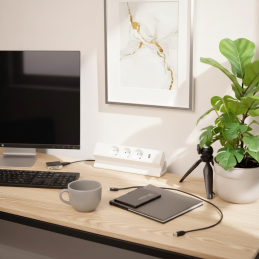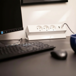 A fehér DESK asztali aljzat kényelmet, praktikusságot és modern megjelenést visz minden munkaterületre. Segít rendben tartani a munkafelületet, és az áramellátás mindig kéznél lesz.