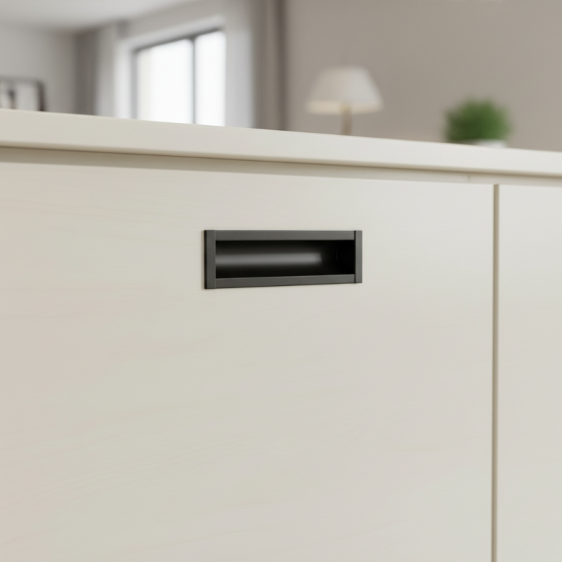 Modern minimalista fogantyú, amely az ajtók vagy fiókok felületébe maráshoz készült. Az elegáns matt fekete felület tiszta és modern megjelenést kölcsönöz a bútornak.