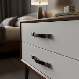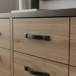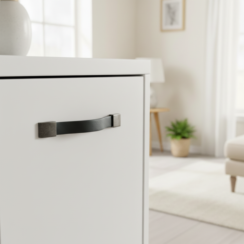 Stílusos és elegáns fogantyú valódi marhabőrből fekete kivitelben, fekete fém végekkel kiegészítve. Enyhe íveltségének köszönhetően kényelmesen megfogható, és tökéletesen illeszkedik modern és ipari enteriőrökbe.