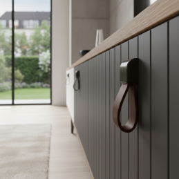 Az elegáns LEATY bőr fogantyú valódi barna bőrt ötvöz fekete fém véggel fekete kivitelben. Modern formájának és minőségi anyagainak köszönhetően prémium és időtlen hatást kelt. Alkalmas szekrényekhez, fiókokhoz és ajtókhoz, és kellemes, puha tapintási komfortot ad a bútornak.