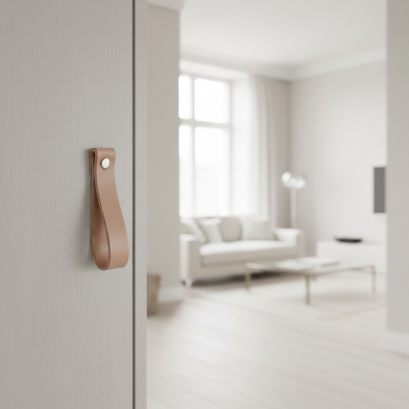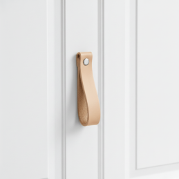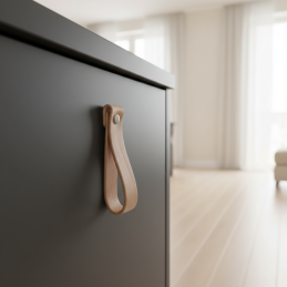 Exkluzív, valódi bőrből készült fogantyú matt alumínium végződéssel és 98 mm-es magassággal. Nagyméretű fogantyúkkal kombinálható.