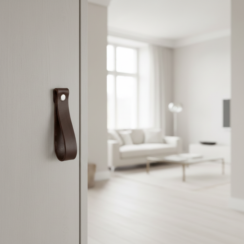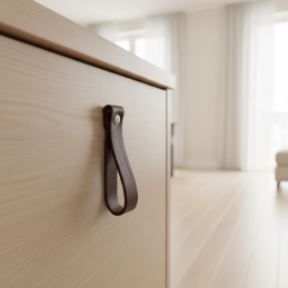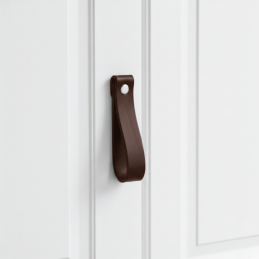 Bőr fogantyú DOLCE Maxi sötétbarna kivitelben elegáns, természetes és időtlen hatást kelt. Az igazi bőr luxus, meleg akcentust ad a bútornak, és a hosszabb fogantyú hangsúlyosabb megjelenést biztosít, így ideális szekrényekhez, komódokhoz vagy nagyobb fiókokhoz. A sötétbarna árnyalat szépen illik a fához, természetes anyagokhoz és modern felületekhez is.