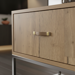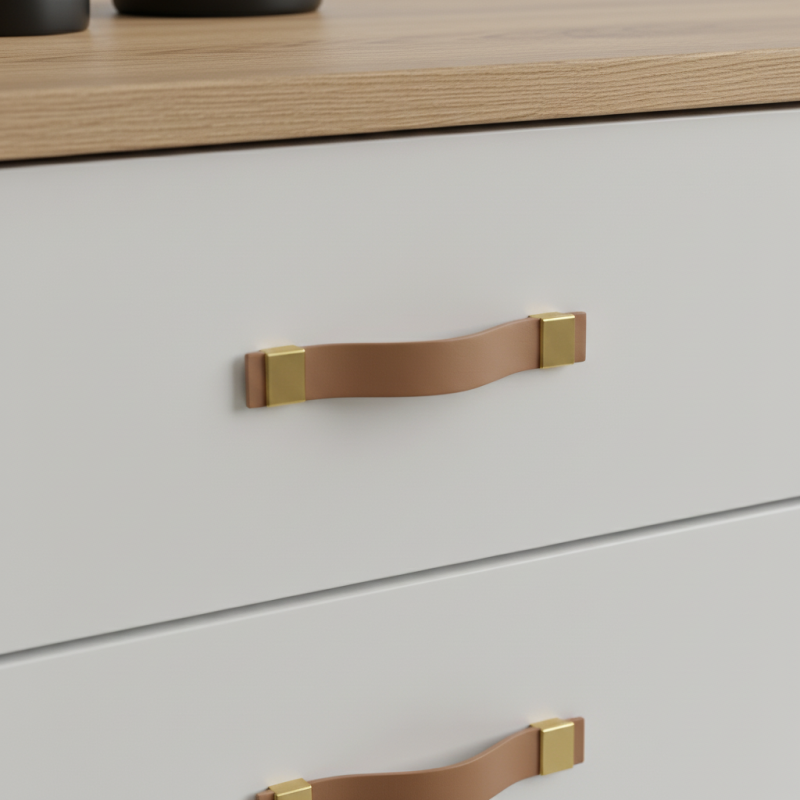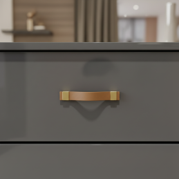 Elegáns bőr fogantyú DALLAS ötvözi a modern dizájnt a luxus kivitelezéssel. Finoman formázott barna árnyalatú bőr, amelyet arany színű fém végek egészítenek ki, időtlen elemet alkot, amely alkalmas konyhákba, nappali bútorokhoz, gardróbokhoz vagy komódokhoz.