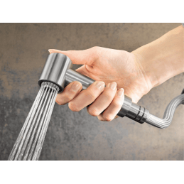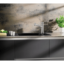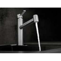 Kihúzható zuhanyfej: átkapcsolható hagyományos vagy zuhanysugárra, így könnyebb az edények öblítése és a mosogató tisztítása.