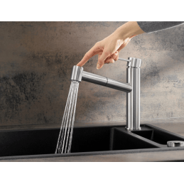 Ez a polírozott rozsdamentes kivitelű konyhai csaptelep ideális esztétika és praktikusság kombinációját kínálja. A kihúzható zuhanyfej, a minőségi alkatrészek és a precíz kidolgozás kényelmet, hosszú élettartamot és könnyű tisztíthatóságot garantálnak – tökéletes megoldás a modern konyha mindennapi használatához.