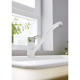 A csaptelep felül elhelyezett vezérlőkarral rendelkezik, amely lehetővé teszi a vízáramlás és a hőmérséklet egyszerű és pontos beállítását. A 180°-ban elforgatható kifolyó elegendő munkateret biztosít a mindennapi használat során.