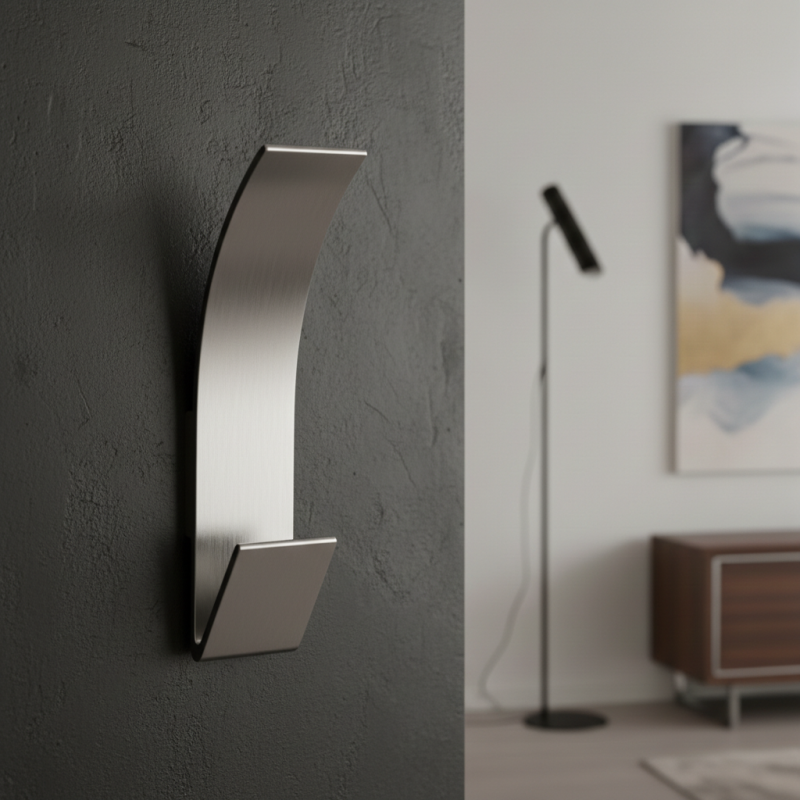 A modern dizájnos ALBERTO fogas időtlen rozsdamentes kivitelben elegáns és funkcionális kiegészítő a mai enteriőrökbe. Sima, ívelt formája tiszta és kifinomult hatást kelt, miközben praktikus megoldást nyújt ruhák, táskák vagy kiegészítők felakasztására.