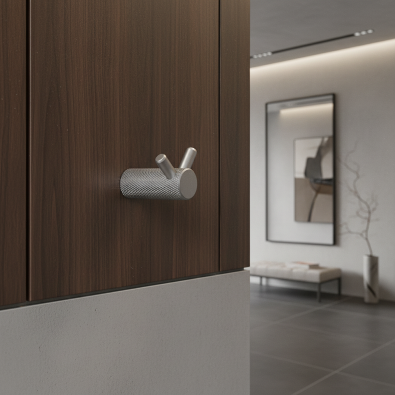 Az INDUST fogas nemesacél matt felülettel modern ipari megjelenést kölcsönöz elegáns szatén kivitelben. A bordázott (knurled) felület technikai jelleget ad a fogasnak, és egyben növeli a mindennapi használat során a praktikusságát.