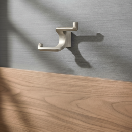 Elegáns, dizájnos fogas ESOLINE modern kivitelben csiszolt nikkel letisztult építészeti formájával és finoman matt felületével időtlen és visszafogott hatást kelt. Eredeti „S” profilja két akasztóval praktikus helyet biztosít a ruhák felakasztására, és egyben hangsúlyos dizájnelemként is szolgál.