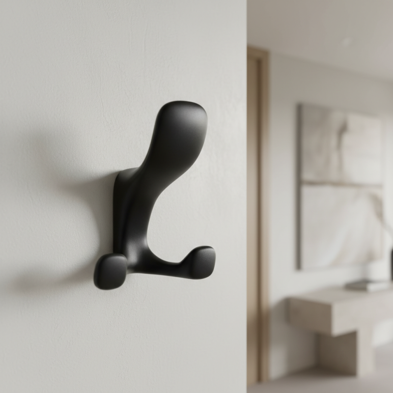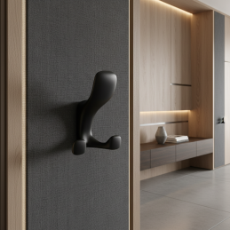 A MESSINA dizájnos fogas elegáns matt fekete kivitelben a modern enteriőrök markáns és stílusos kiegészítője. Organikus, áramvonalas formaterve esztétikus és egyben praktikus, így funkcionális részletként és dekoratív elemként is megállja a helyét.
