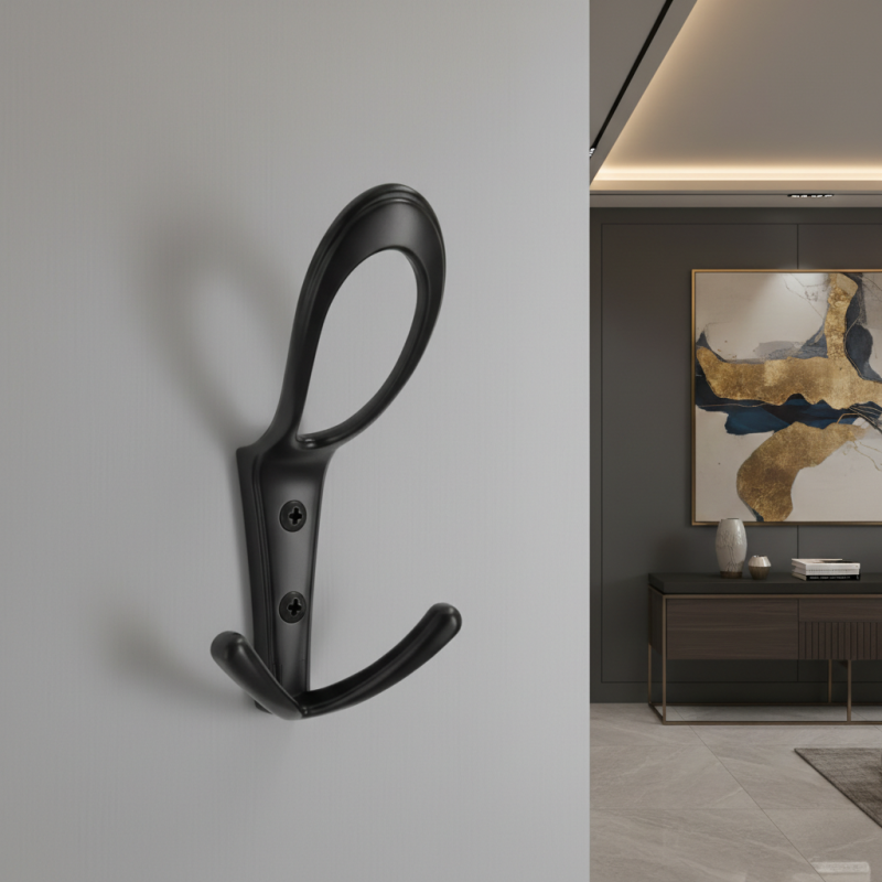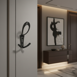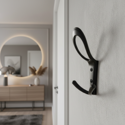 Az elegáns és feltűnő BELAGO Maxi fogas matt fekete kivitelben modern megoldást kínál a stílusos és funkcionális ruhafüggesztéshez. Meghosszabbított, finoman formázott kialakítása könnyed és elegáns megjelenést kölcsönöz, ugyanakkor a praktikumot is biztosítja az alsó dupla akasztónak köszönhetően.