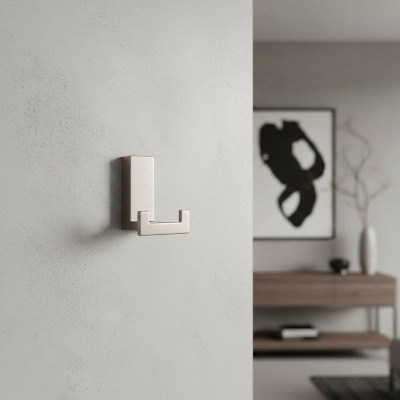 Kompakt és elegáns dizájnú akasztó szálcsiszolt nikkel kivitelben, amely modern és időtlen hatást kelt. Kis méretének köszönhetően ideális előszobákba, fürdőszobákba, gardróbokba vagy bútorokra, ahol fontos a letisztult dizájn és a funkcionalitás.