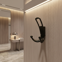 A fogas egy darabból álló szerkezettel és alsó dupla akasztóval rendelkezik, amely elegendő helyet biztosít kabátok, dzsekik, táskák vagy kiegészítők felakasztásához. Elölről szerelhető falra vagy bútorra, a rögzítési pontok láthatóak, így gyors és egyszerű a telepítés.
