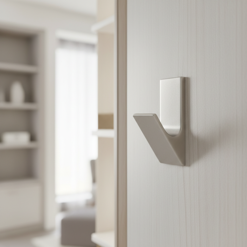 A szerelés a fal, lap vagy bútor hátoldaláról történik a mellékelt csavar segítségével, így a fogas elülső része teljesen tiszta marad, látható rögzítés nélkül.