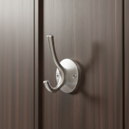 A fogas dupla akasztóval van felszerelve, amely elegendő helyet biztosít kabátok, dzsekik, táskák vagy kiegészítők felakasztásához. Elölről történő falra vagy bútorra szerelésre készült, a rögzítőcsavarok láthatóak, de diszkréten illeszkednek a rozett dizájnjába.