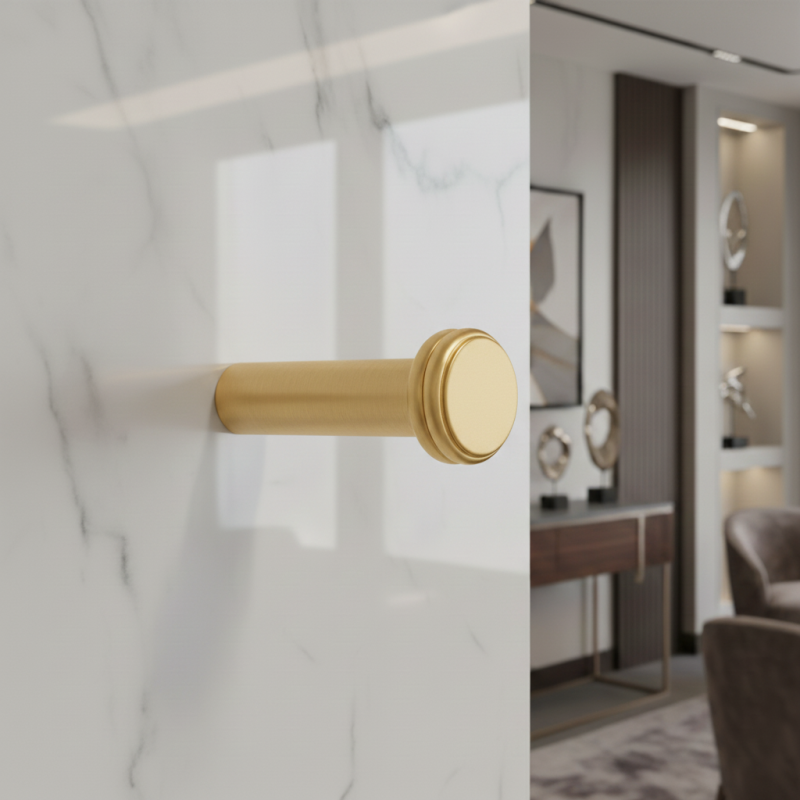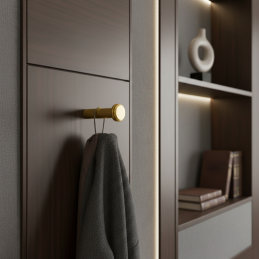 A NURIA fogas arany csiszolt kivitelben luxus és időtlen megjelenést kölcsönöz a belső térnek. Tiszta hengeres formáját finom dekoratív gyűrű egészíti ki, amely elegánsan és harmonikusan hat, így modern fürdőszobákba, előszobákba, gardróbokba és hálószobákba is illik. A csiszolt arany felület kellemes meleg árnyalatot ad, miközben magas ellenállóképességet és egyszerű karbantartást biztosít.