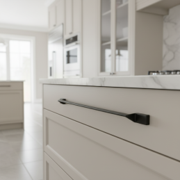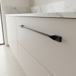 A VENITA fogantyú elegáns kivitelben, fekete matt színben ideális választás modern, ipari és minimalista enteriőrökbe is. Jellegzetes oldalsó törése egyedi dizájnelemet hoz létre, amely már első pillantásra megragadja a figyelmet. Karcsú profiljának, matt felületének és precíz kidolgozásának köszönhetően nagyon modern és időtálló hatást kelt.