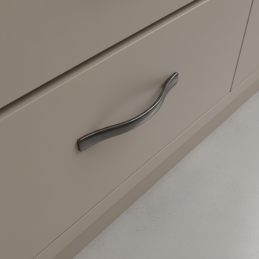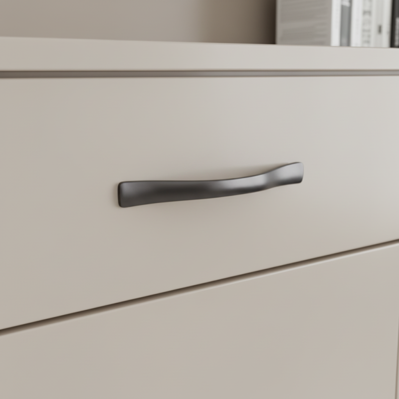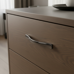 A NICOLA fogantyú antracit matt kivitelben modern, elegáns és karakteres dizájnt kínál, amely tökéletesen illeszkedik a mai enteriőrökbe. Finoman hullámos formája ergonomikus és kellemes fogást biztosít, míg a sötét matt felület luxus és kifinomult megjelenést kölcsönöz a bútornak.