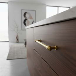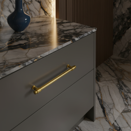 Elegáns fém fogantyú fényes arany luxus kivitelben, amely időtlen és reprezentatív megjelenést kölcsönöz a bútornak. Alkalmas konyhákba, fürdőszobákba, gardróbokba, komódokba és más modern vagy klasszikus stílusú beltéri bútorokhoz.