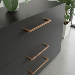 Stílusos BRISA fogantyú réz felülettel, amely kivételes dizájnkiegészítő a modern, ipari és vintage stílusú bútorokhoz. A meleg réz árnyalat egyedi karaktert és érdekes vizuális hangsúlyt ad a szekrényeknek vagy komódoknak, amely gyönyörűen érvényesül sötét fán, fekete bútoron vagy világos felületeken. A minimalista forma finoman lekerekített élekkel...