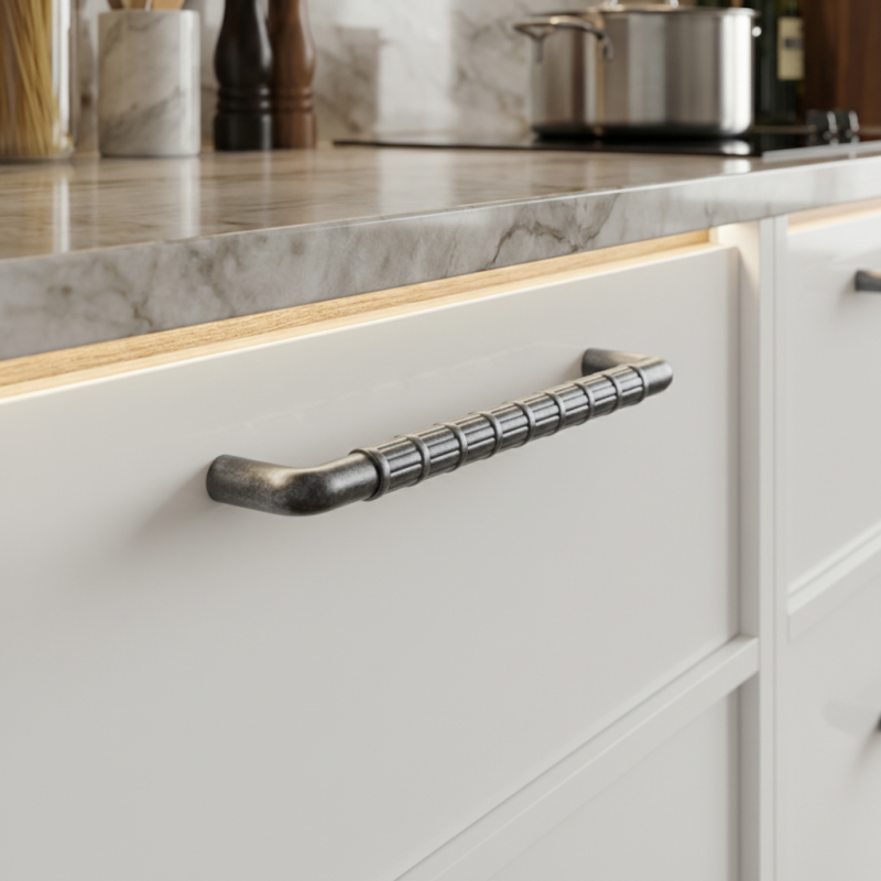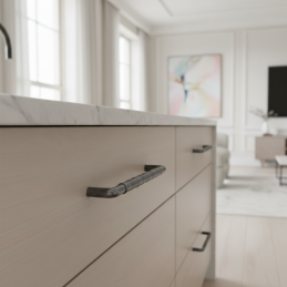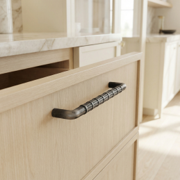 A TAU dizájn fogantyú antik fekete kivitelben markáns részlet, amely autentikus ipari és enyhén vintage karaktert kölcsönöz a bútornak. A patinázott antik fekete felület elegáns és időtlen hatást kelt, miközben kiemeli a precízen kidolgozott recézett fogást.