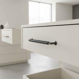 A dizájnos STIGMA bútorfogantyú antik fekete kivitelben autentikus ipari megjelenésével és markáns recézett fogásával hívja fel magára a figyelmet. A patinázott antik fekete felület karaktert és vintage hangulatot kölcsönöz a fogantyúnak, így tökéletesen illik loft, ipari és rusztikus enteriőrökbe is.