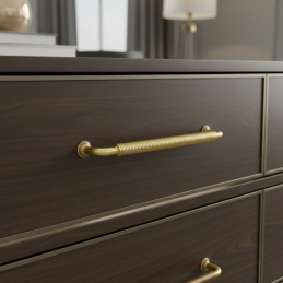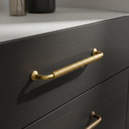 A dizájnos STIGMA bútorfogantyú antik arany kivitelben feltűnő ipari karakterével és precíz recézett fogásával hívja fel magára a figyelmet. Az antik arany árnyalatú felületkezelés autentikus, enyhén vintage megjelenést kölcsönöz a fogantyúnak, amely tökéletesen illik ipari, loft vagy rusztikus enteriőrökbe.