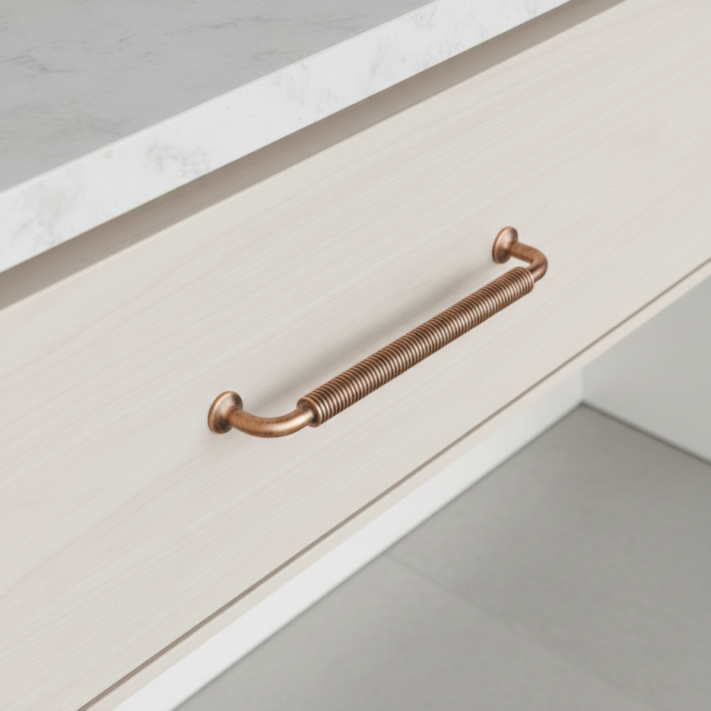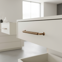 A fogantyú kiváló minőségű fémből készült, amely nagy szilárdságot, stabilitást és hosszú élettartamot biztosít. A kefélt sárgaréz felület meleg, autentikus és kellemes tapintású, emellett növeli a használat kényelmét.
