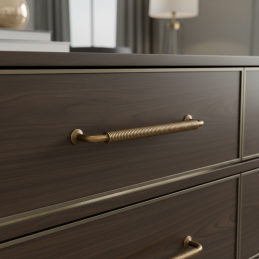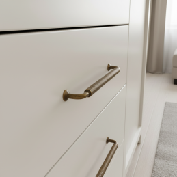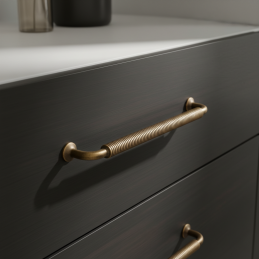 Dizájnos bútor STIGMA fogantyú kefélt sárgaréz kivitelben lenyűgöző ipari megjelenéssel és részletesen kidolgozott recézett fogóval. Ez a jellegzetes dizájn eredeti és kézműves hangulatot kölcsönöz a bútornak, így ideális választás loft, ipari és rusztikus enteriőrökbe.