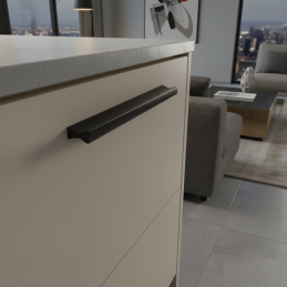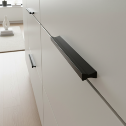 A PIREA fogantyú fekete matt kivitelben modern minimalista dizájnt képvisel luxus karakterrel. A vékony profil és a finom formázás elegáns és időtlen megjelenést kölcsönöz a bútornak. A matt fekete felület stílusos hatást kelt, és tökéletesen illeszkedik a modern enteriőrökhöz, különösen a sötét vagy kontrasztos világos felületekhez.