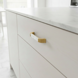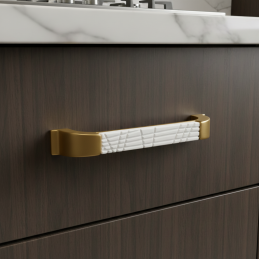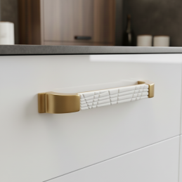 A BRAGA kerámia fogantyú óarany felületkezeléssel eleganciát, hagyományt és finom luxust kölcsönöz a belső térnek. A meleg óarany tónusú cinkötvözet fémtest és a dombormintás fehér porcelán kombinációja feltűnő dekoratív elemet alkot, amely azonnal magára vonja a figyelmet.