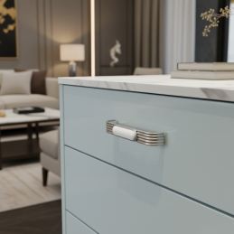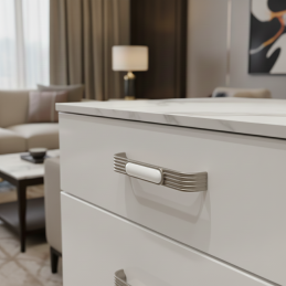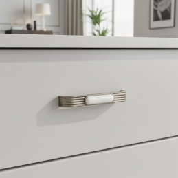 A FARO kerámia fogantyú fekete matt kivitelben modern, karakteres és egyben elegáns kiegészítő, amely kifinomult kontrasztot kölcsönöz a bútornak. A matt fekete cinkötvözet fém és a finom dombormintás fehér porcelán kombinációja harmonikus és egyben rendkívül vonzó dizájnelemet hoz létre.