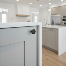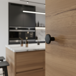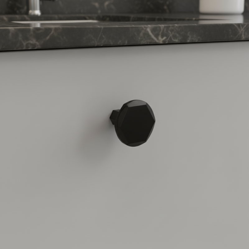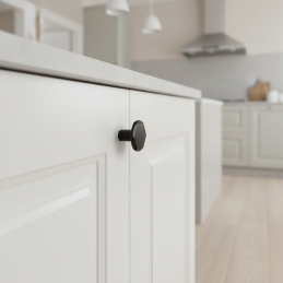 A LAMEGO gombfogantyú fekete matt kivitelben elegáns és modern részlet, amely tökéletesen kiegészíti a nagyobb, azonos dizájnú LAMEGO fogantyúkat. Finoman fazettált formája luxus és időtlen hatást kelt, így modern, ipari és minimalista enteriőrökbe is illik.