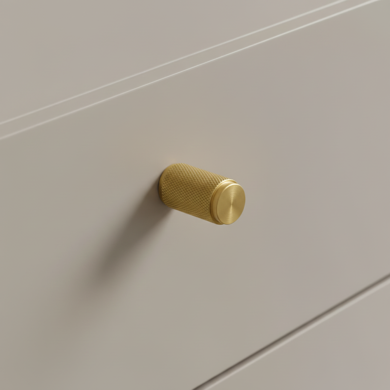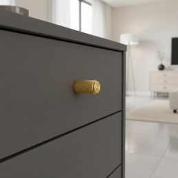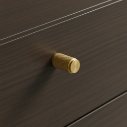 A LAYLA gomb csiszolt arany kivitelben elegáns és egyben modern részlet, amely luxus akcentust ad a bútornak anélkül, hogy hivalkodó lenne. A finoman bordázott (knurled) felület kiemeli a precíz kidolgozást, javítja a fogást, és érdekes fényjátékot hoz létre a matt csiszolt arany felületen.