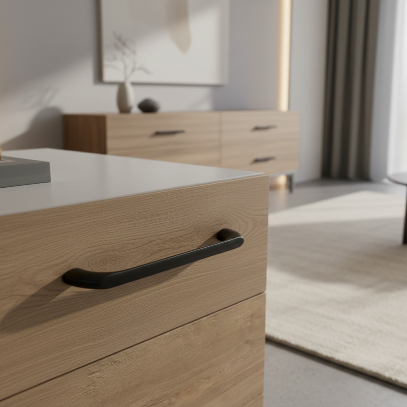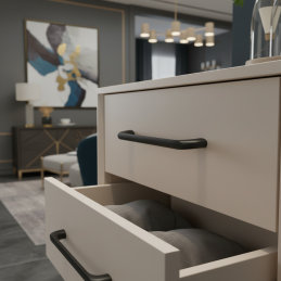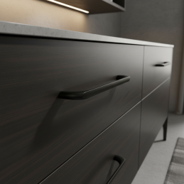 A PAMELA fogantyú fekete matt felülettel elegáns és modern kiegészítő, amely kiemeli a kortárs bútorok letisztult vonalait. Finoman lekerekített, ergonomikus formája könnyed és harmonikus hatást kelt, így természetesen illeszkedik minimalista és modern enteriőrökbe is. A matt fekete szín kifinomult megjelenést kölcsönöz a fogantyúnak, és markáns, ugyanakkor időtálló kontrasztot teremt világos és sötét bútorokon egyaránt.