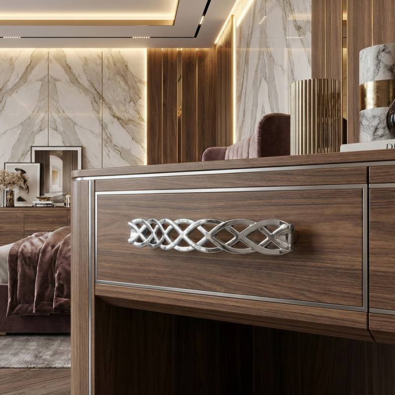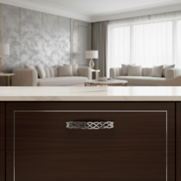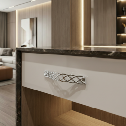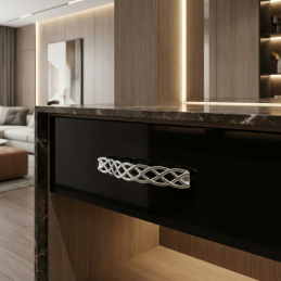 Az elegáns ALINA bútorfogantyú fényes króm kivitelben dekoratív, fonott mintájával hívja fel magára a figyelmet, amely finom, mégis karakteres megjelenést kölcsönöz a bútornak. A fényes króm modern, tiszta és időtlen hatást kelt, így tökéletesen illik modern és klasszikus enteriőrökbe egyaránt.