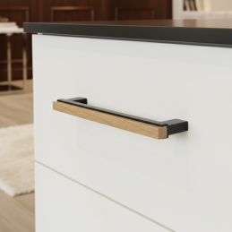 A modern ISABEL bútorfogantyú a fekete fém és a lakkozott tölgyfa kontrasztját ötvözi. Az anyagok elegáns kombinációja időtlen dizájnt teremt, amely illik a minimalista, skandináv és modern enteriőrökbe is.