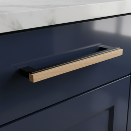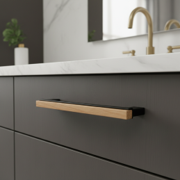 A lakkozott tölgyfa rész melegséget és természetességet visz a térbe, míg a fekete fém fogantyúk szilárdságot és vizuális stabilitást adnak. A fogantyú ideális választás fürdőszobabútorhoz, komódhoz, szekrényhez vagy konyhabútorhoz.