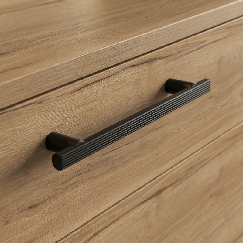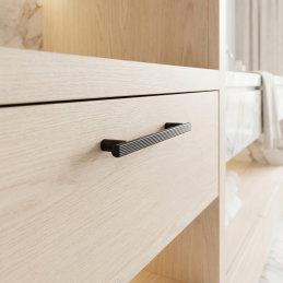 Modern LIZA bútorgomb elegáns fekete matt kivitelben ideális kiegészítő konyhabútorokhoz, szekrényekhez, komódokhoz vagy gardróbokhoz. A minimalista dizájn finom barázdákkal az elülső részen modern megjelenést kölcsönöz a fogantyúnak, miközben kényelmes és biztos fogást biztosít.