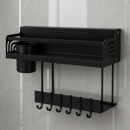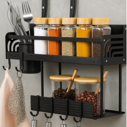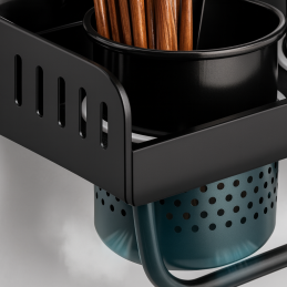 Praktikus XENIA függesztett konyhai polc matt fekete színben, multifunkcionális megoldás a modern otthonok számára. Egy kompakt termékben ötvözi a fűszertartót, késállványt és evőeszköz csepegtetőt, így konyhája átlátható és rendezett lesz.