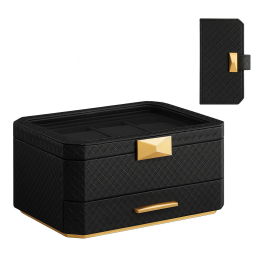A BUGATI WATCH ékszerdoboz a BUGATI kollekcióból a kifinomultság és a funkcionalitás megtestesítője. A letisztult, lecsapott élekkel rendelkező dizájn, a dombornyomott, szövött mintás PU bőr és a baguette csiszolás ihlette aranyszínű fém elemek révén nemcsak praktikus kiegészítő, hanem feltűnő stíluselem is lesz.
