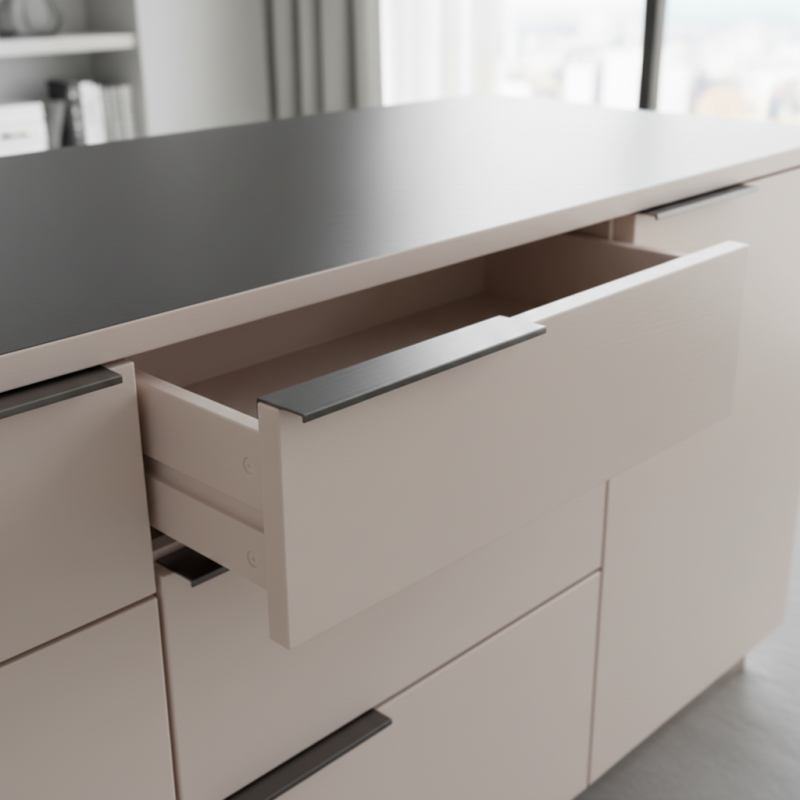 A fogantyú nagyon vékony profillal rendelkezik, ami kényelmes használatot biztosít zavaró vizuális hatás nélkül a bútoron.