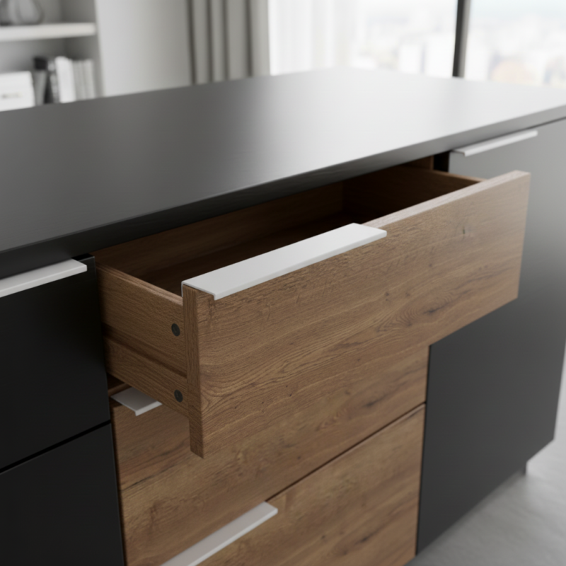 A fogantyú az elülső oldalról szerelhető az ajtó vagy fiók élére.